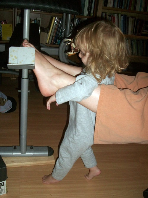 Hanging on Mama’s feet and Apu’s gym machine