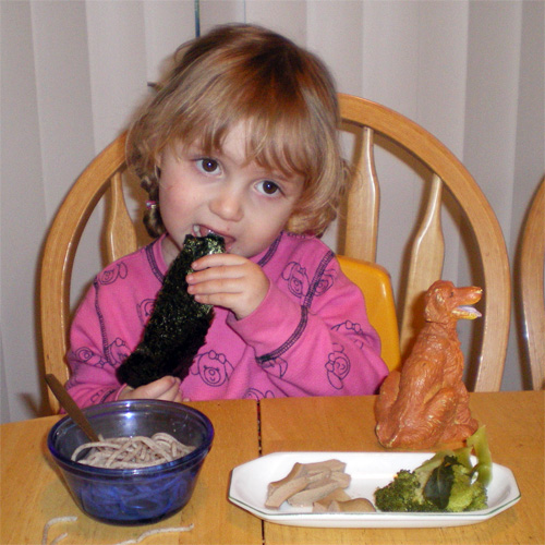 Dinner: nori (toasted seaweed), udon (buckwheat noodles), virsli (hot-dog, not plastic-dog) and broccoli