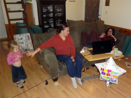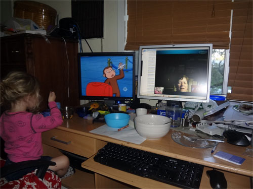 L-R: Stella, Curious George, Nagyi via Skype from Hungary