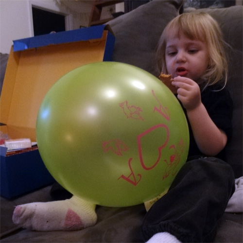 Holding the balloon from Aunt Panni’s wedding with my knees