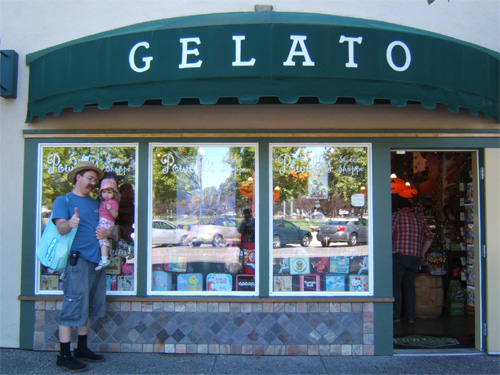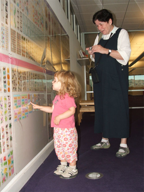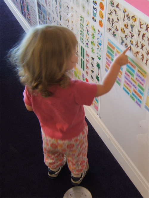 Admiring Curious George stickers in Petaluma
